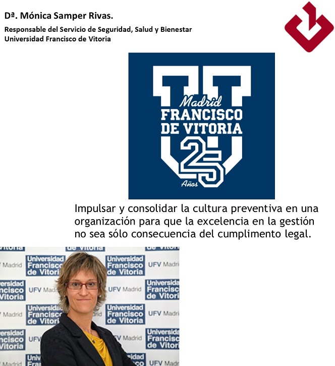 En la Universidad Francisco de Vitoria (UFV) hemos tenido la oportunidad, a través de Mónica Samper -Responsable del Servicio de Seguridad, Salud y Bienestar- de comprobar cómo, más allá del mero cumplimiento legal, se está implantando en toda su gestión un importante desarrollo de la cultura preventiva, dando ejemplo a las futuras generaciones.