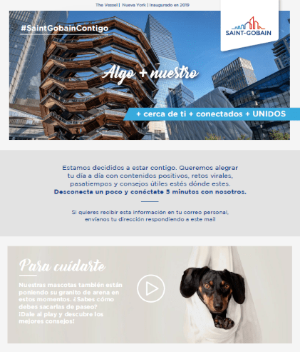 También puesto en marcha una newsletter, denominada Algo + Nuestro, en la que, junto a contenidos corporativos, se han incluido pasatiempos, música solidaria y actividades de ocio. Cada semana, en este canal, también se han promovido los llamados CORONATIPS, consejos útiles en formato vídeo para hacer frente a la nueva cotidianeidad: cómo salir con tu mascota, cómo desinfectar tu vehículo, cómo salir a bares y terrazas, cómo desinfectar tu puesto de trabajo o cómo realizar visitas a clientes, entre otros …