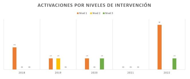 Por último, el Nivel 3 ha sido activado en dos ocasiones, la primera como consecuencia de la pandemia de la Covid-19[1], mientras que la segunda ocasión fue derivada del hundimiento de un buque en aguas internacionales, donde existieron supervivientes, personas desaparecidas y fallecidos, por lo que requirió de atención a familiares, así como de diferentes tipos de coordinación con organismos oficiales (consulados, servicios sociales, servicios funerarios, entidades del tercer sector y organizaciones gubernamentales)